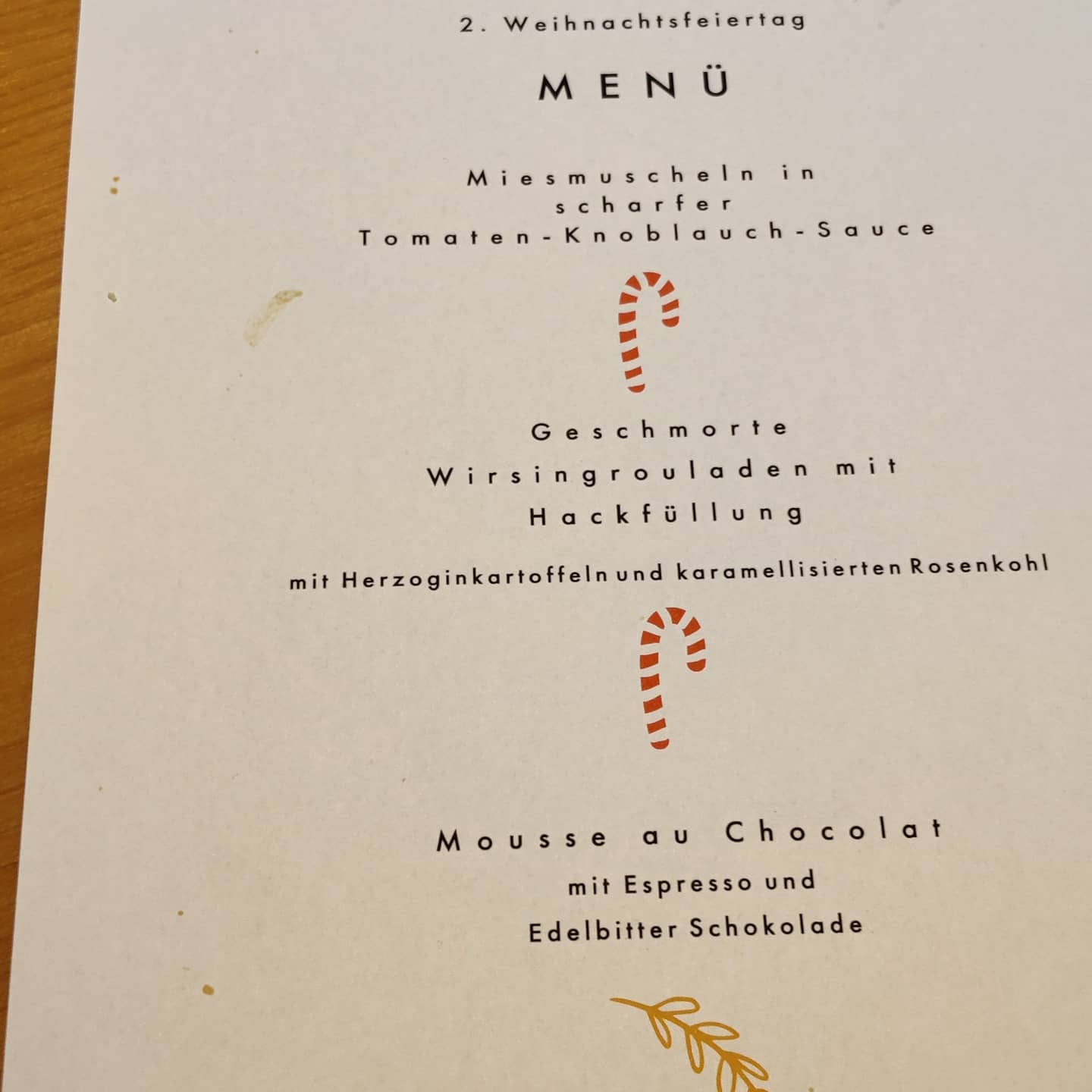 Zum 2. Feiertag gab es als Vorspeise Muscheln in Tomatensauce gegart. Als Hauptspeise Wirsingrouladen mit Hackfleisch gefüllt und als Beilagen Herzoginenkartoffeln und Rosenkohl. Als Nachspeise Mousse au Chocolat aus Edelbitter Schokolade und Espresso