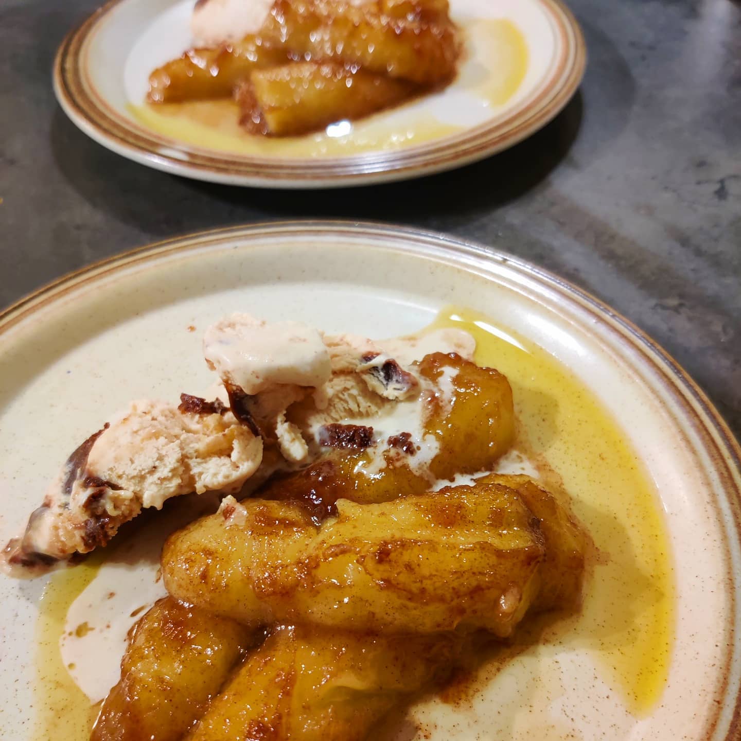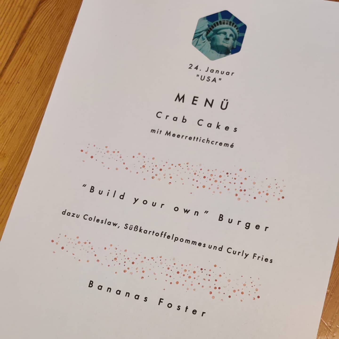 Heute ist das Thema USA. Als Vorspeise gab es “Crab Cakes” mit Nordseekrabben. mit Meerrettich Creme. Dann konnte man sich seinen Burger selbst zusammen stellen mit verschieden Zutaten zur Auswahl auf Brioche Burger. Als Nachspeise gab es Banana Foster mit Eiscreme.