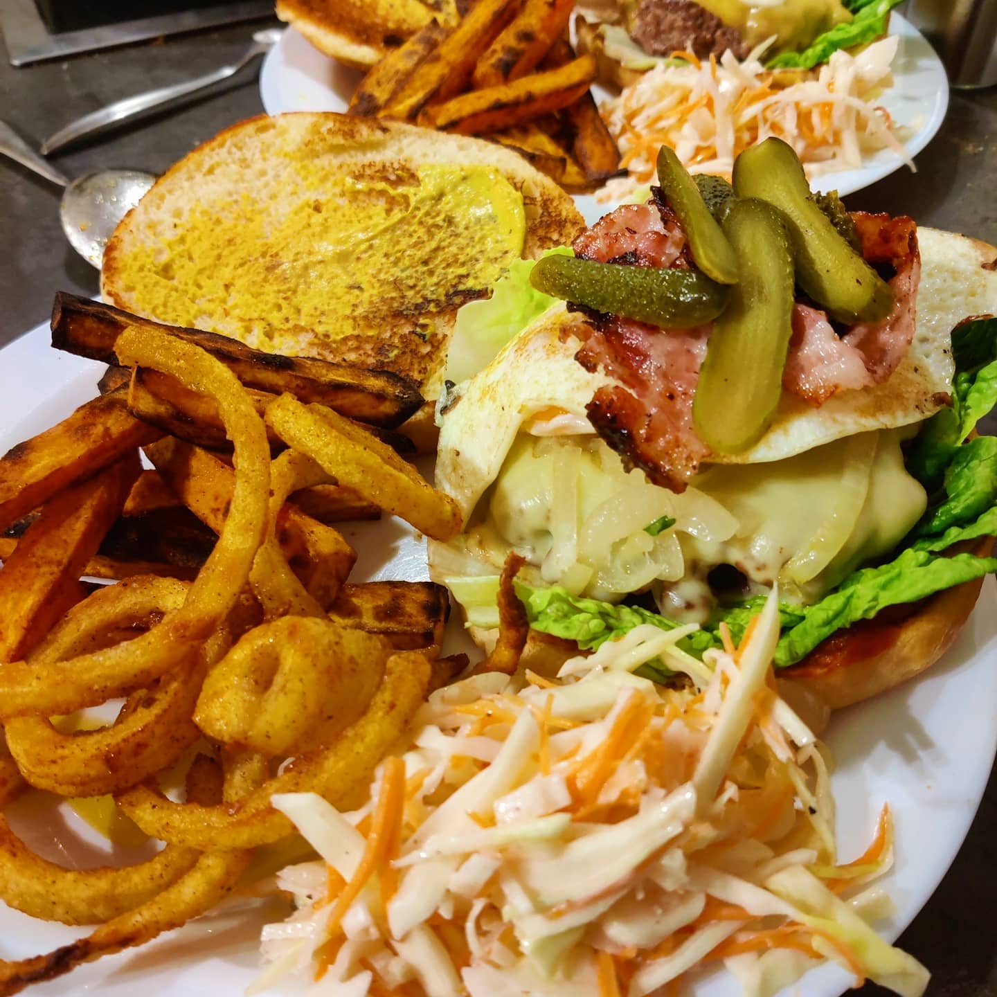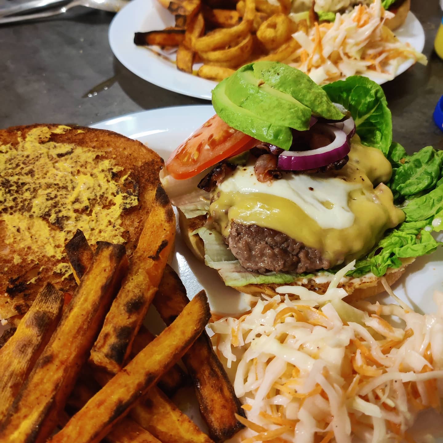 #crabcakes #burger #beefburger #meerrettich #brioche #bacon #süßkartoffel #süßkarktoffelpommes #coleslaw #curlyfries #avocado #bananafoster