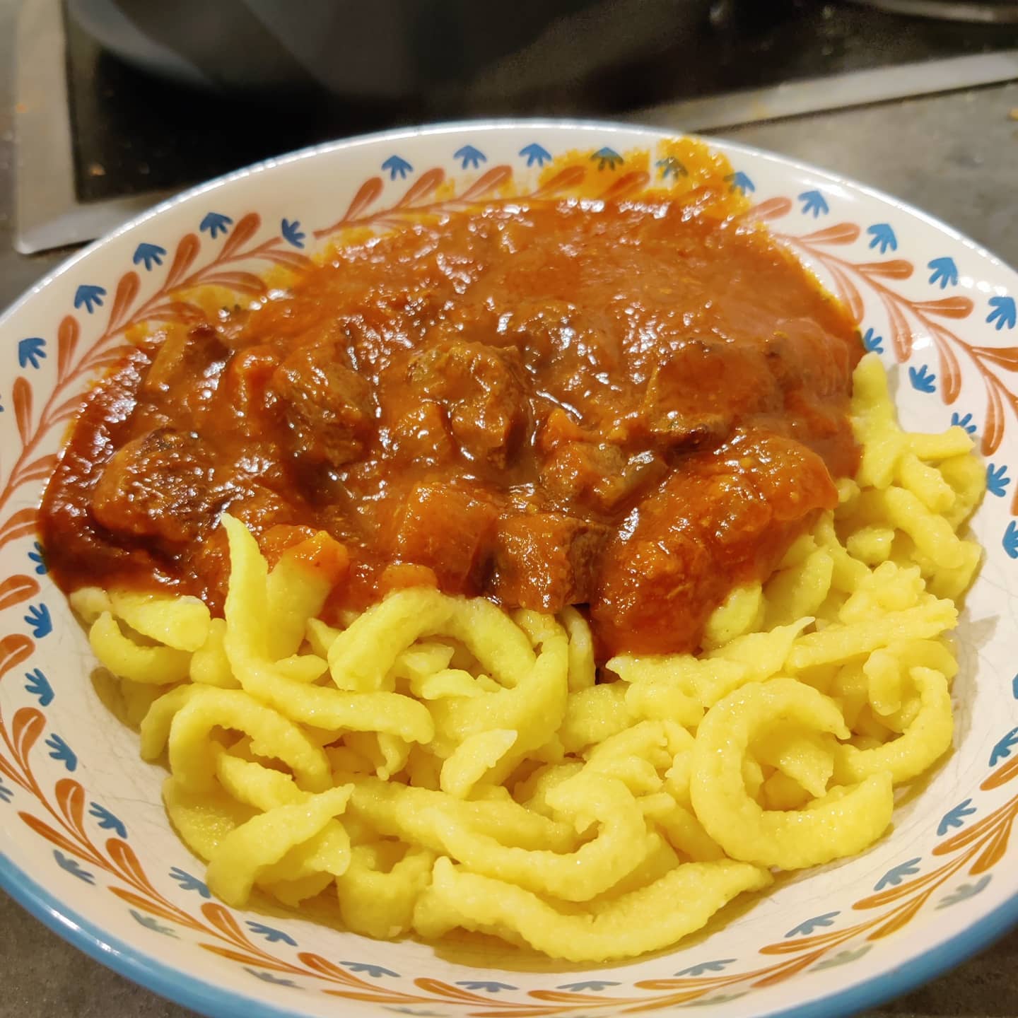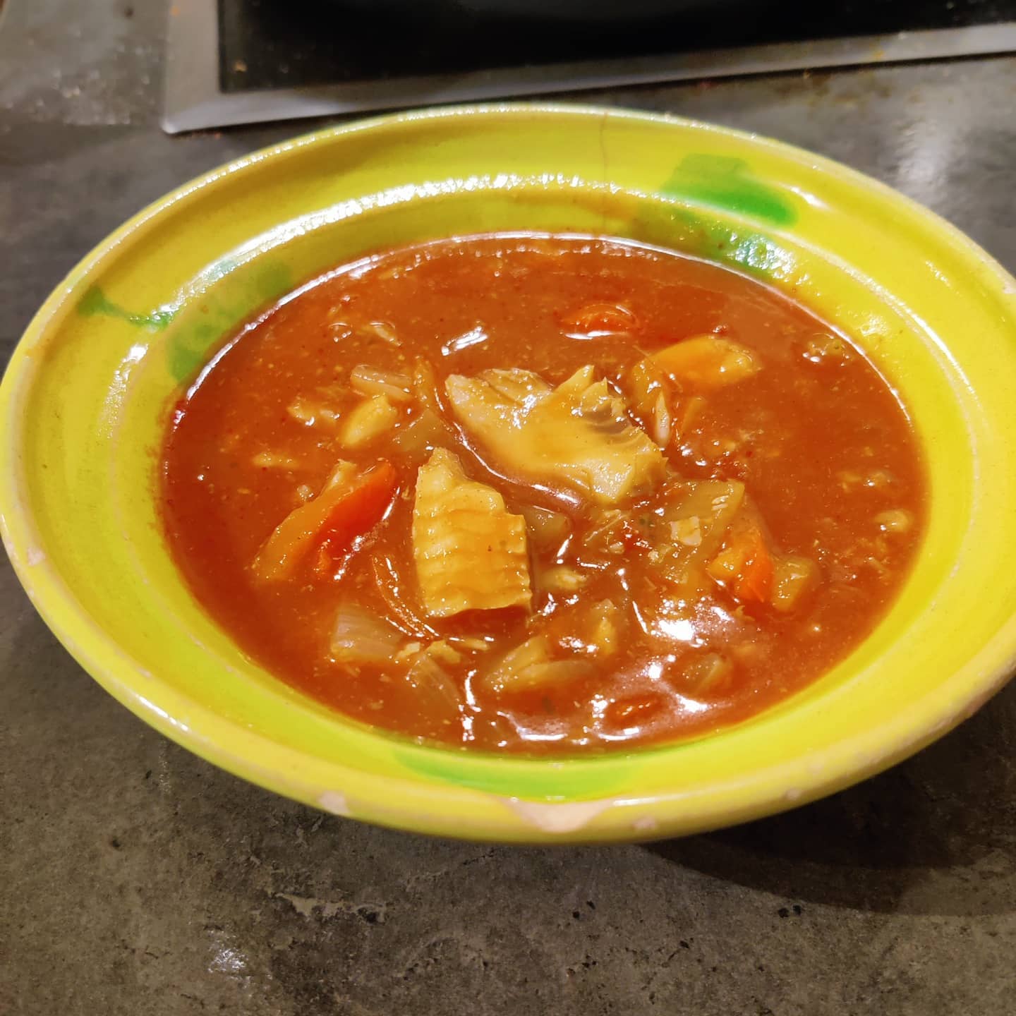 Heute gab es ein Menü mit dem Thema Ungarn. Als Vorspeise gab es die Fischsuppe Halászlé. Als Hauptspeise Ungarisches Gulasch Pörkölt mit Spätzle. Als Nachspeise Lángos mit Bananen und Nutella.
